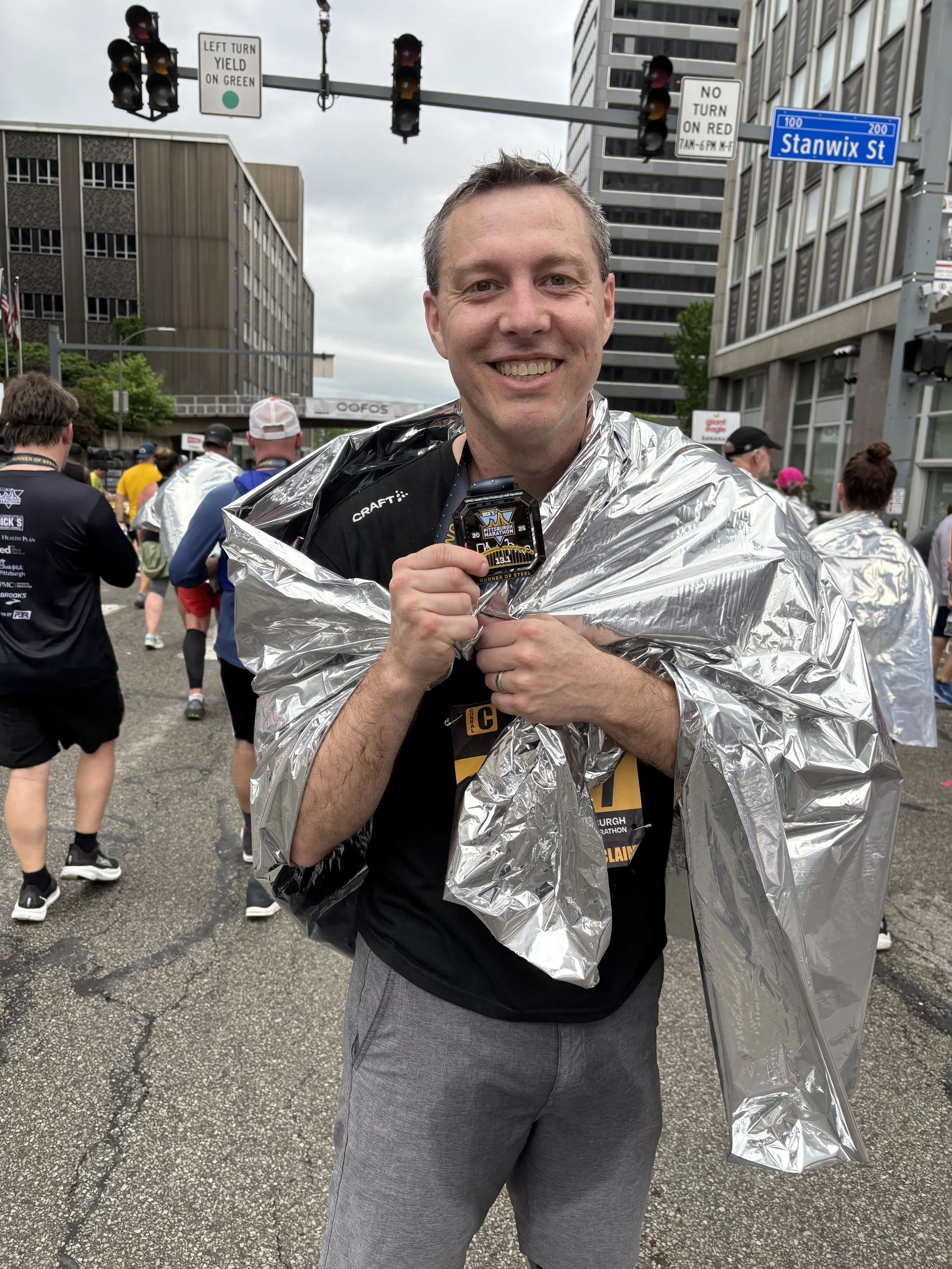 Me at the finish line after 13.1 miles!! (ugh — sorry — I didn’t pee my pants. That’s just sweat. Embarrassing. Sorry.)